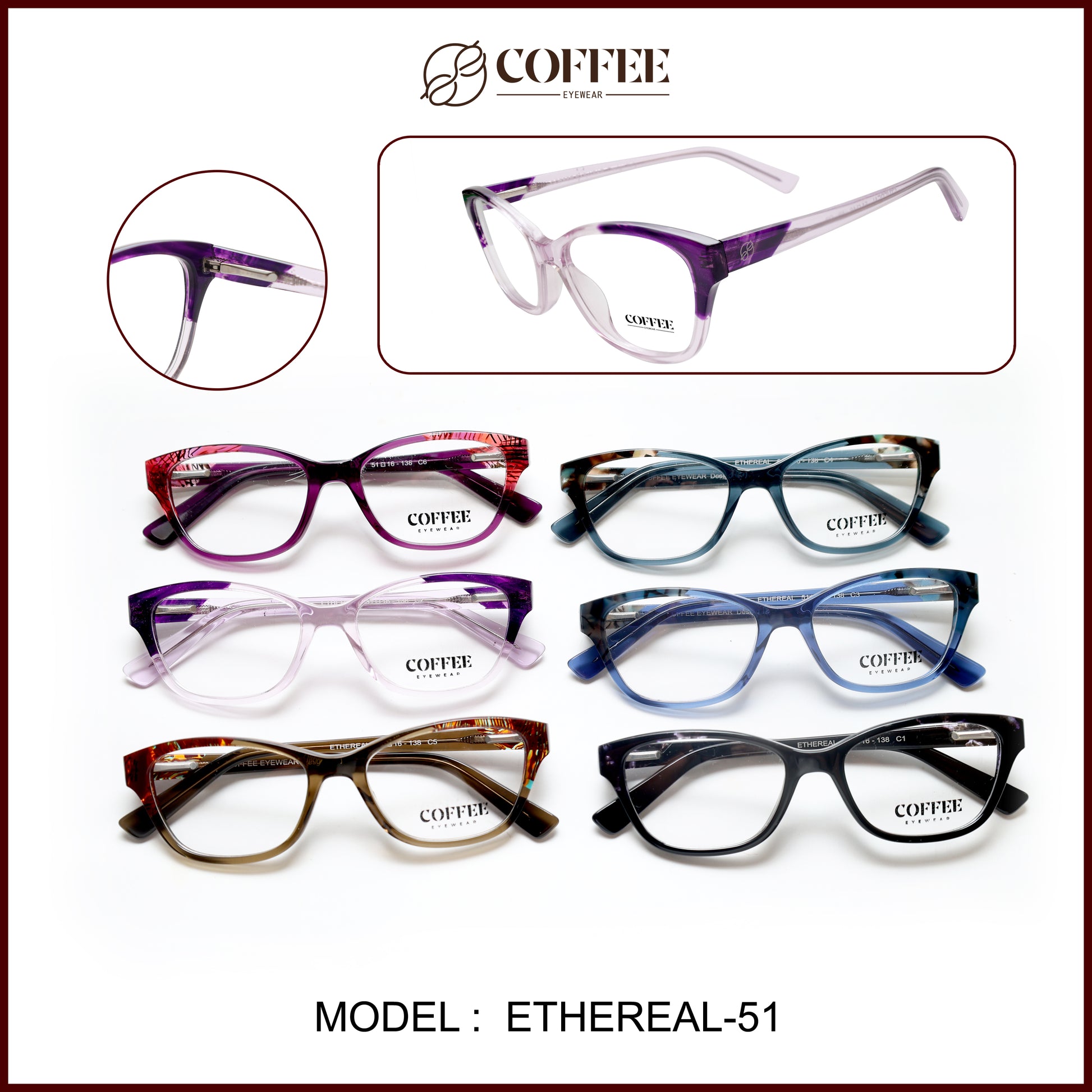 ETHEREAL offers a bold and stylish cat eye silhouette crafted in high-grade acetate. With spring hinges and unique color tones, this unisex frame delivers a refined aesthetic, ideal for fashion-forward customers and high-rotation retail counters.